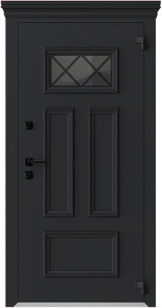 Оцинкованная сталь, атмосфероустойчивая порошковая краска (цвет на выбор), декоративный алюминиевый штапик (классич. дизайн), стеклопакет трехкамерный, зеркальный бронза/хром на выбор (с черной вкладной. декор. решеткой)