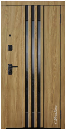 панель МДФ 16 мм, пленка, «Дуб Мадейра» (96), черная патина/декоративный штапик цвет «Дуб Мадейра» (96), черная патина, вставка из черного глянцевого стекла, черная металлическая вставка