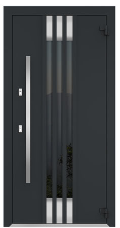 Оцинкованная сталь, атмосфероустойчивая порошковая краска (цвет на выбор), декор. алюм. рейки, декоративные металлические вставки цвет черный (цвет на выбор), стеклопакет четырехкамерный, графит