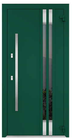 Оцинкованная сталь, атмосфероустойчивая порошковая краска (цвет на выбор), декор. алюм. рейки, декоративные металлические вставки из нержавеющей стали (цвет на выбор)), стеклопакет четырехкамерный, графит